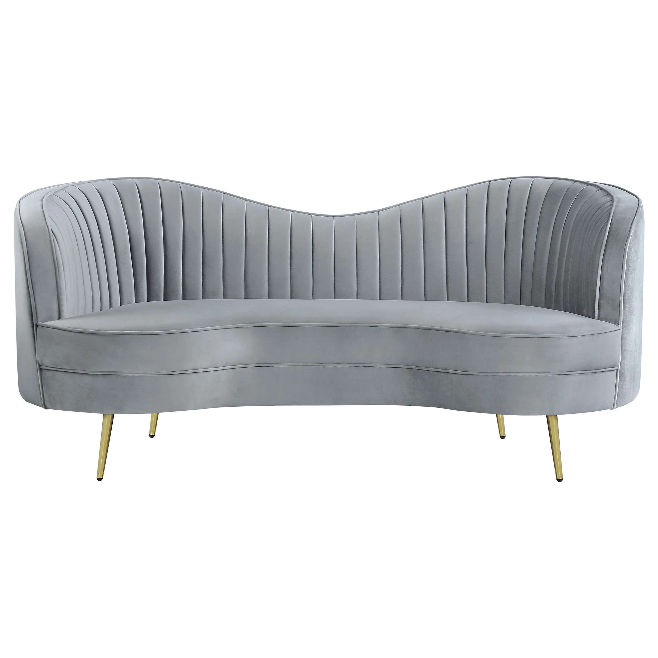 Perfect for a couple having cocktails, this Art Deco-inspired loveseat features a bright blue velvet upholstery set off with steel tapered legs. Contrasting the deep blue hue is a polished gold finish on each leg. Along with a channel tufted interior cushions and kidney-shaped silhouette, this retro-like loveseat lends a vintage flair and a twist on the timeless tuxedo style. Set the stage with this contemporary loveseat, allowing it to act as the centerpiece in a room. Or grab the entire ensemble, including a sofa and barrel-style chair. Key Features: • Sculptural modern glam in a beautiful shade of blue velvet • Loveseat features an inverted camel back creating the right touch of curve appeal • Tailored, vertical channels frame inside back providing a stylish back drop to the kidney shaped attached bench seat • Gold stainless steel tapered legs add the finishing touch