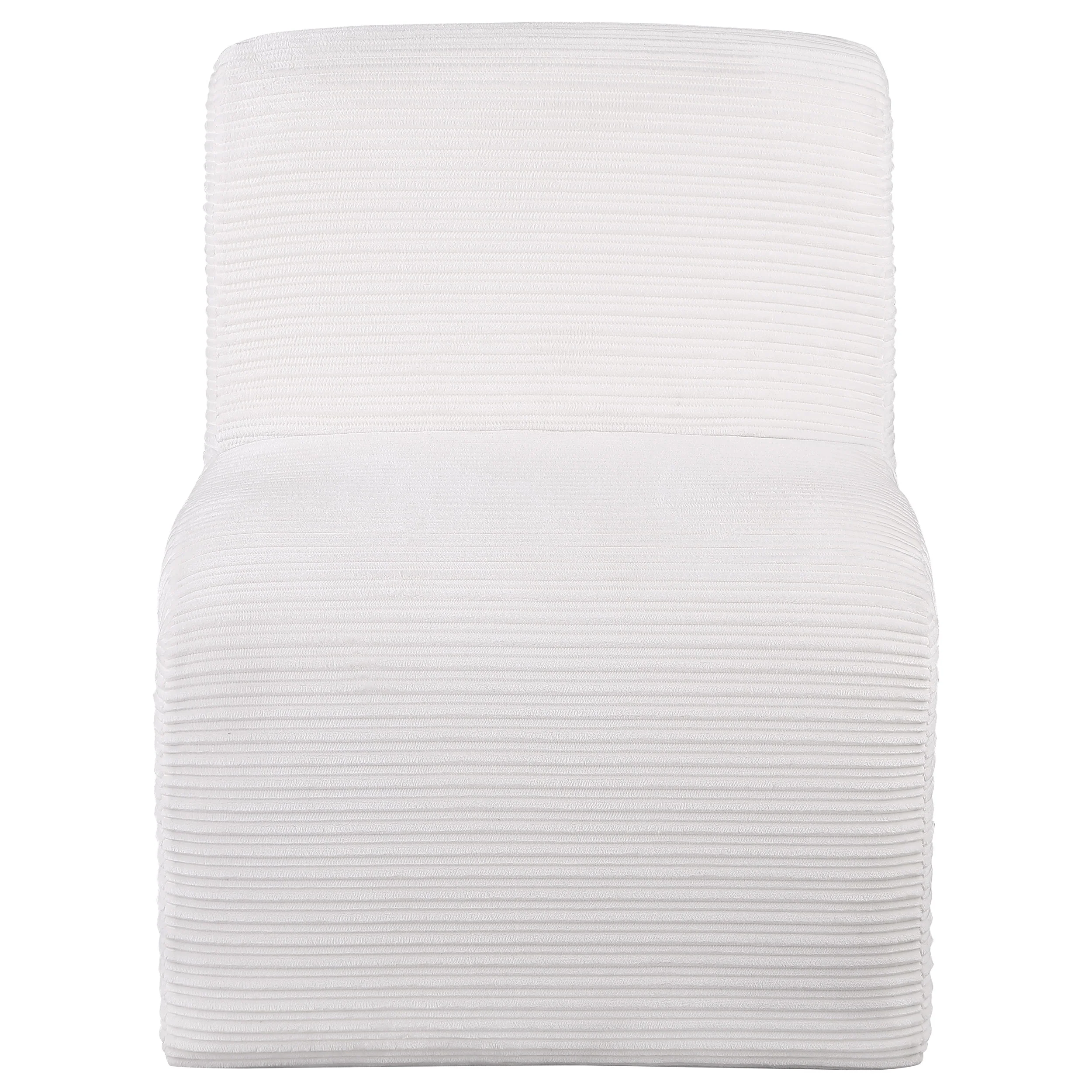 Introduce a sculptural component to your compelling seating group with this modern accent chair. It's an armless profile with a sinuous curvature that brings alluring elegance in any setting. Neutral upholstery has a ribbed look, creating impeccable texture and depth. The chair is structured with metal and plywood for durability, covered in foam for excellent cushioning that promotes comfort. Choose a pair for a refined living room or den setting. Key Features: • Upgrade a seating group with the curvy appeal of a modern upholstered accent chair • A sinuous silhouette brings modern artistry and elegance with sculpted presence • Ribbed texture highlights neutral upholstery, creating depth for robust curvature • Armless silhouette and curvy form create a compelling combination for your sophisticated living room • Legs include levelers that ensure a smooth placement on any flooring surface