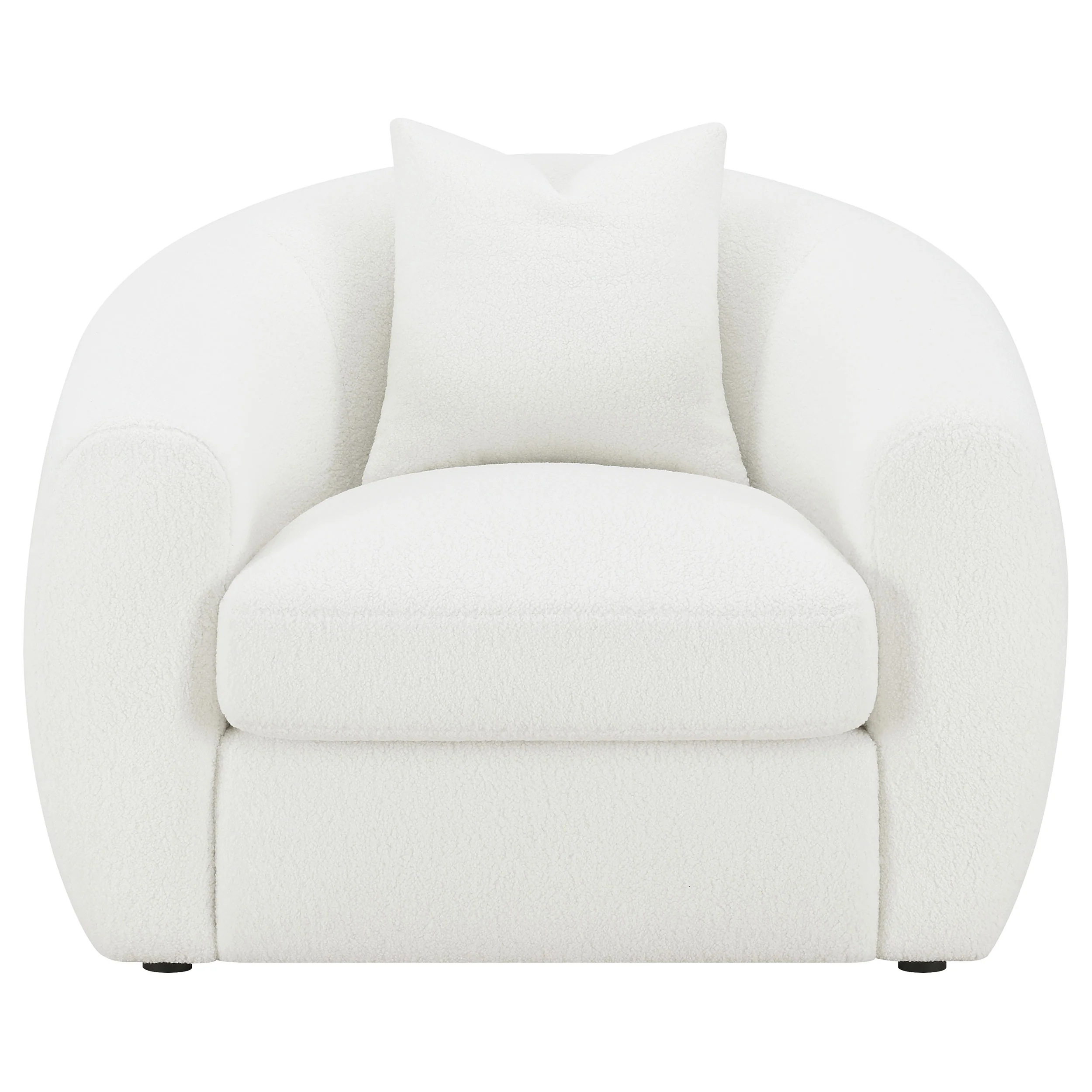 Add inviting elegance to your space with this contemporary accent chair upholstered in soft faux sheepskin boucle fabric. Its smooth curved frame and sloped armrests create a sculptural, cloud-like silhouette that enhances any modern interior. A plush seat cushion offers comfort and support, while the tight back keeps its refined shape. Finished with subtle black legs for gentle contrast, this chair includes a matching faux down accent pillow for an extra touch of coziness and sophistication._x005F_x000D_ Key Features: • Accent chair wrapped in natural faux sheepskin boucle upholstery • Curved silhouette with sloped arms adds softness and sophistication • Plush seat cushion ensures lasting comfort and modern elegance • Tight back maintains a tailored and structured contemporary look • Includes matching accent pillow with soft faux down fill for coziness • Black legs provide subtle contrast to the bright, airy upholstery